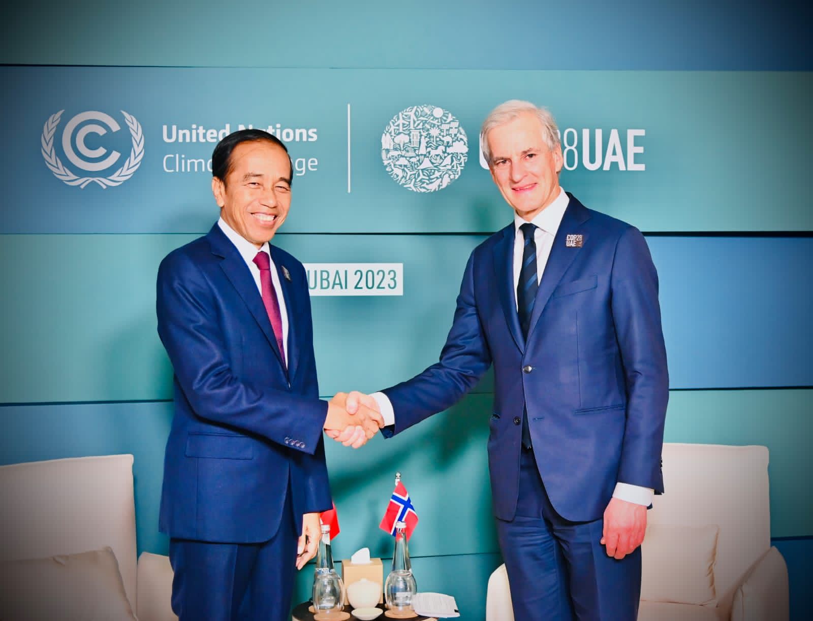 Presiden RI Joko Widodo (Jokowi) melakukan pertemuan bilateral dengan Perdana Menteri Norwegia Jonas Gahr Støre di sela-sela kegiatan World Climate Action Summit (WCAS) COP28 Dubai, Jumat, 1 Desember 2023.