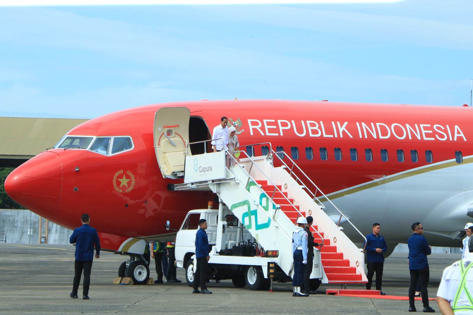 Danlanud Sultan Hasanuddin Marsma TNI Bonang Bayuaji G,S.E., M.M., menyambut kedatangan Presiden Republik Indonesia, Ir. Joko Widodo didampingi Ibu Iriana Joko Widodo, bertempat di Apron Baseops Lanud Sultan Hasanuddin, Makassar, Sulawesi Selatan, Kamis (4/7/2024).