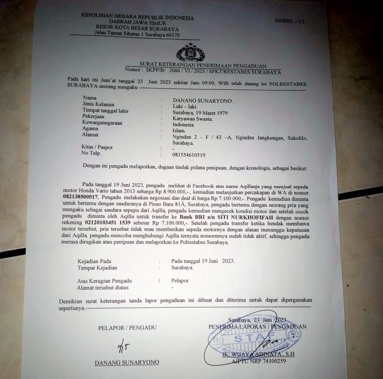 “Sementara itu, dari harga Awal Rp 8.900.000 terjadilah negosiasi dan deal dengan harga Rp 7.100.000 di jln Ploso baru 18A.Surabaya pukul 20.00 wib”, ujarnya.