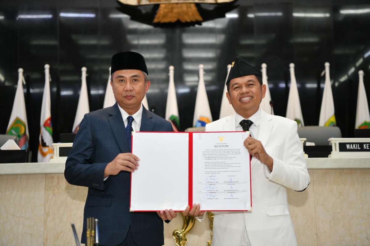 KOTA BANDUNG – Serah terima jabatan dari Penjabat Gubernur Bey Machmudin kepada Gubernur Jawa Barat Dedi Mulyadi dan Wakil Gubernur Jabar Erwan Setiawan berlangsung di Ruang Rapat Paripurna DPRD Provinsi Jawa Barat, Kota Bandung, Jumat (21/2/2025).