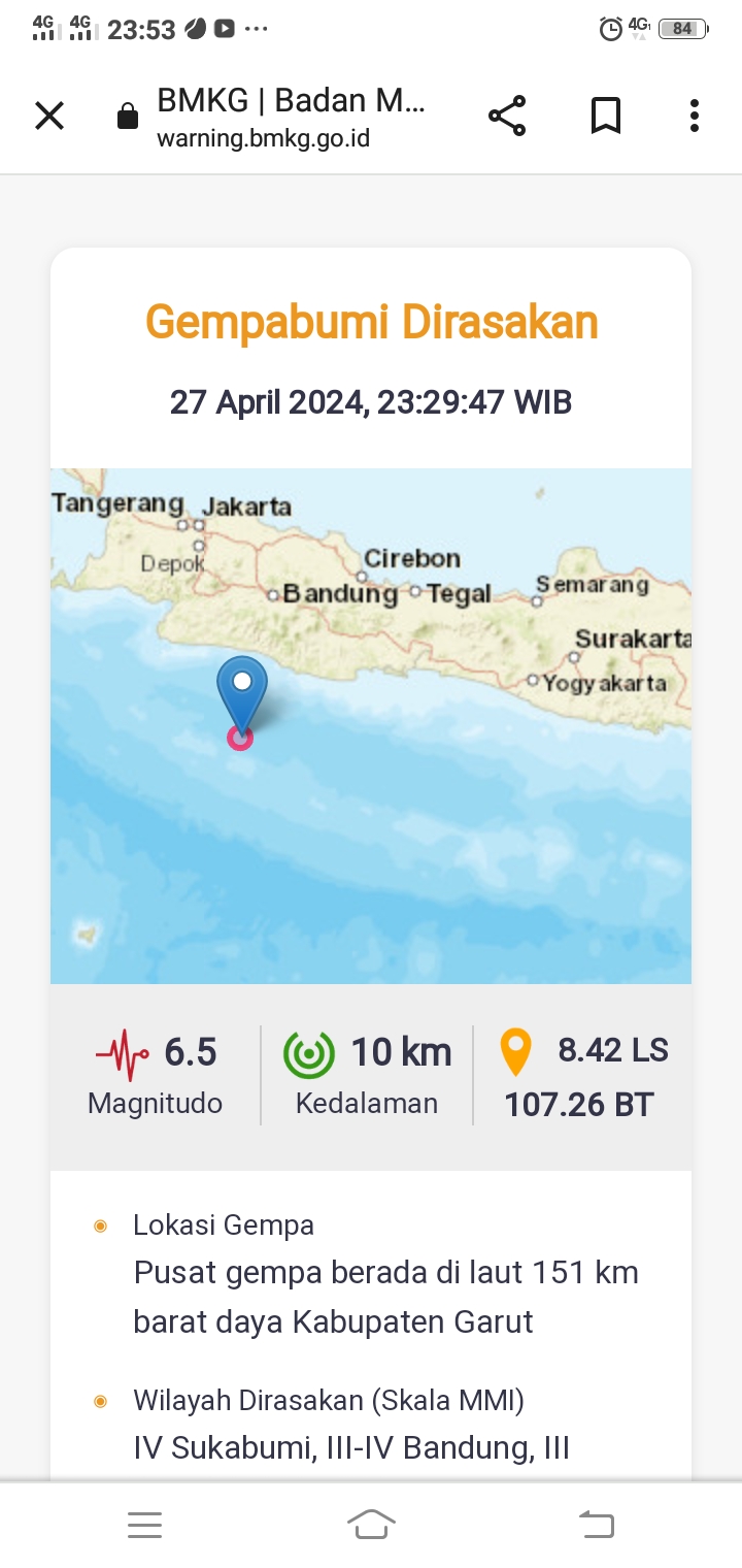 BMKG meliris Gempa yang berkekuatan 6.5 Magnitudo, gempa tersebut hampir terasa menyeluruh di wilayah jawa barat dan jawa tengah. Pusat gempa berada di laut 151 km barat daya Kabupaten Garut Sabtu ( 27 april 2024). Pukul 23:34,47 wib.