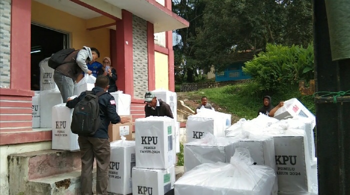 Sebanyak 845 kotak suara dan 676 bilik suara berikut perlengkapan alat Pencoblos Pemilu Pemilihan Presiden RI dan wakil Presiden, DPD RI, DPR RI, DPRD provinsi dan DPRD Kabupaten, KPU kabupaten Sukabumi melalui PPK kecamatan kadudampit melakukan pergeseran logistik pemilu ke masing masing TPS. Se kecamatan kadudampit. Selasa (13/02/24).