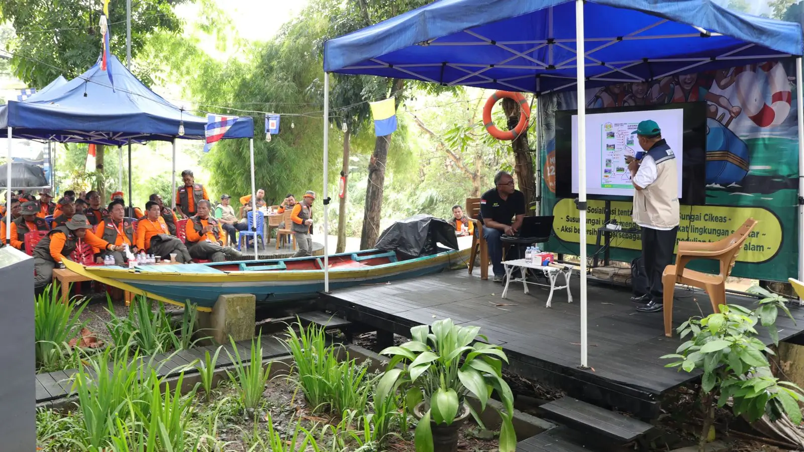 Para peserta tampak antusias menyimak paparan dari Puarman, Ketua Komunitas Peduli Sungai Cileungsi Cikeas (KP2C), tentang sistem peringatan dini banjir berbasis masyarakat yang telah diterapkan sejak 2016 hingga sekarang. Bukan tanpa alasan, paparan tersebut dilaksanakan dalam rangka agenda kunjungan lapangan para peserta SDMT ke wilayah Kabupaten Bogor, tepatnya dalam melihat bagaimana pengendalian banjir dilakukan oleh pemerintah daerah setempat yang bekerja sama dengan komunitas masyarakat.