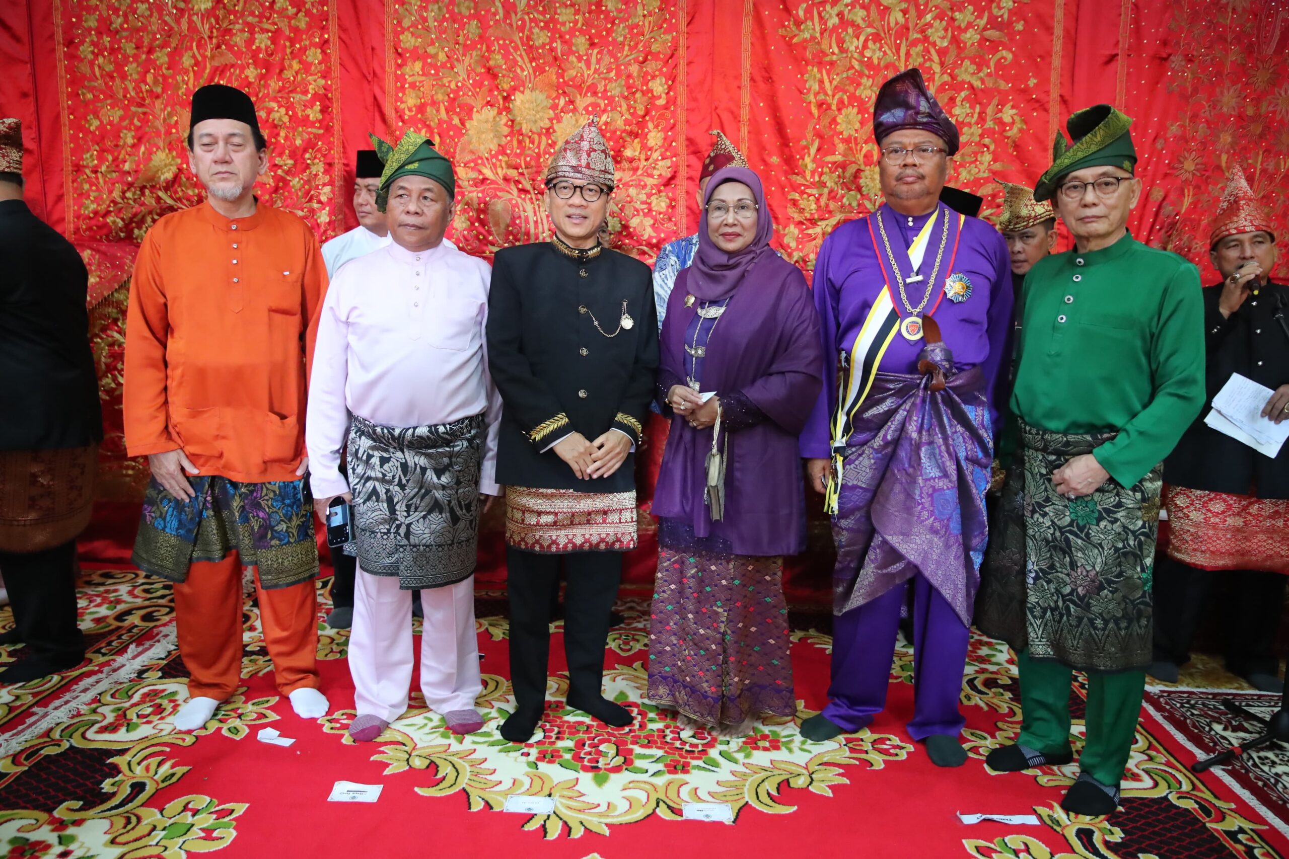 Mengenakan pakaian adat yang didominasi warna gelap, Mendes Yandri mengikuti seluruh prosesi penganugerahan gelar adat dengan khidmat.