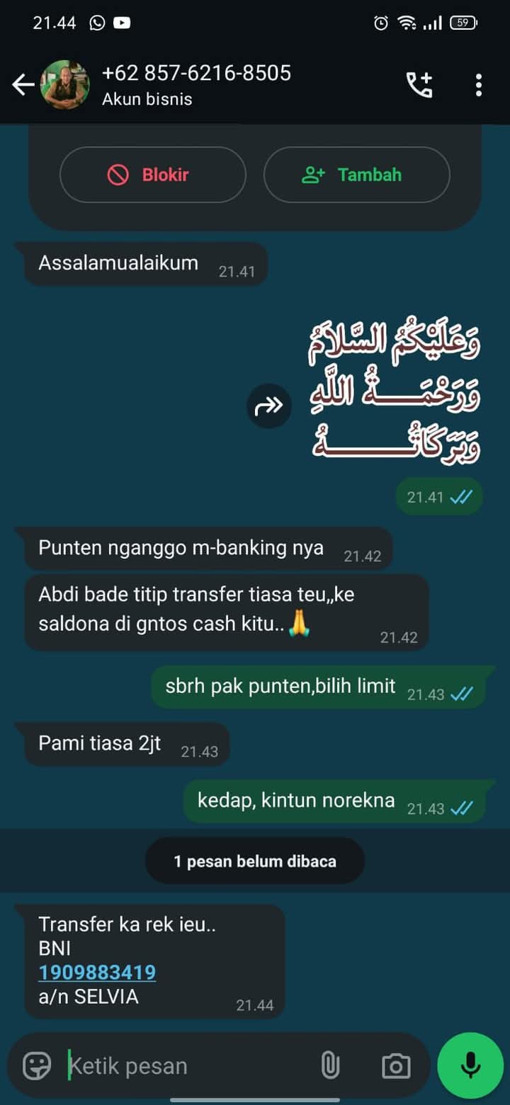 Dalam pesan WhatsApp nya, oknum tersebut meminta ditransfer sejumlah uang 2 juta Rupiah kepada kades Cikahuripan Ujang malik dengan dalih meminjam.