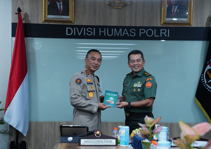 Pertemuan yang berlangsung hangat dan terlihat akrab tersebut, diakhiri dengan saling memberikan cinderamata berupa plakat dari Puspen TNI dan Kadiv Humas Polri. (*)