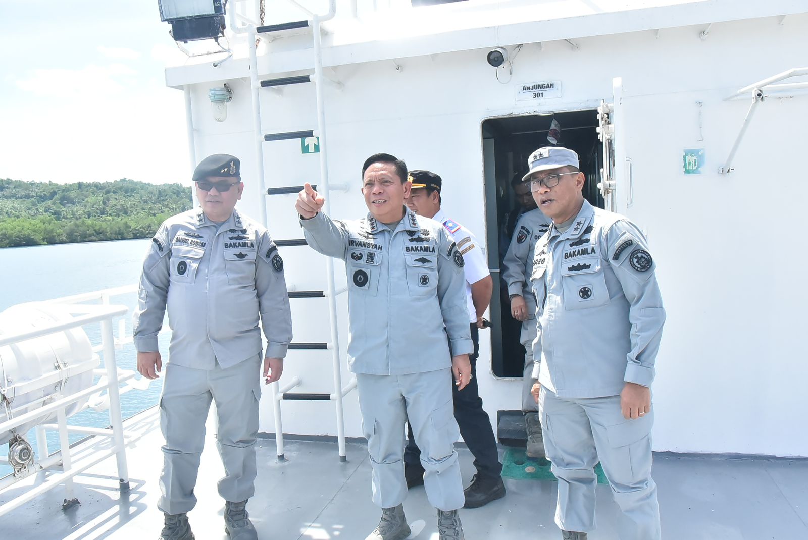 Pada kunjungan ini, Kepala Bakamla RI didampingi oleh Deputi Kebijakan dan Strategi Bakamla RI Laksda Bakamla Dr. Gregorius Agung W.D., M.Tr. (Han)., Deputi Informasi, Hukum, dan Kerja Sama Bakamla RI Laksda Bakamla Dr. Samuel H. Kowaas, M.Sc., CSBA., Kepala Zona Bakamla Tengah Laksma Bakamla Octavianus Budi Susanto, S.H., M.Si., M.Tr.Opsla., Kepala Biro Sarana dan Prasarana Laksma Bakamla Rudi Parulian Simorangkir, S.E., Kepala Biro Perencanaan dan Organisasi Laksma Bakamla I Gusti Putu Aswan Candra, M.M., CHRMP., M.Tr.Opsla., beserta jajaran lainnya. (*)