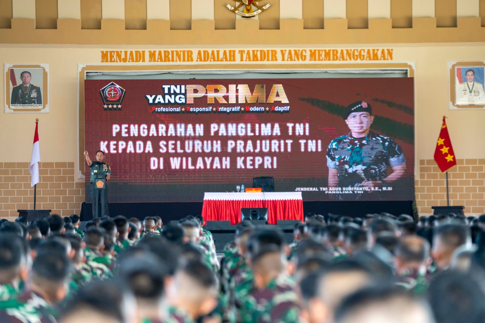 Batam – Panglima TNI Jenderal TNI Agus Subiyanto melakukan tatap muka sekaligus memberikan pengarahan kepada 837 prajurit, bertempat di Mako Yonif 10 Marinir/SBY, Batam Kepulauan Riau, beberapa waktu lalu.