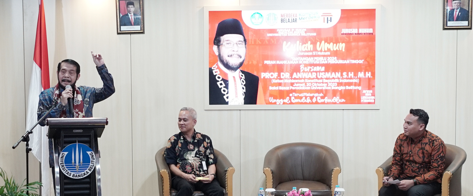 BANGKA BELITUNG – Ketua Mahkamah Konstitusi (MK) Anwar Usman memberikan kuliah perdana yang bertajuk “Tantangan Pemilu 2024: Peran Mahkamah Konstitusi dan Perguruan Tinggi”, pada Jumat (20/10/2023) di Universitas bangka Belitung. Anwar menyampaikan Pemilihan Umum pada 2024 mendatang berdasarkan konstitusi, terbagi ke dalam beberapa kelompok (cluster), yaitu pemilu untuk memilih anggota DPR, DPD, Presiden dan Wakil Presiden, dan DPRD [Pasal 22E ayat (2) UUD 1945]. Selain itu, pada Pemilu Tahun 2024 mendatang, juga akan diselenggarakan Pilkada Serentak Tahun 2024 diikuti 548 daerah, yang terdiri dari 38 provinsi, 415 kabupaten, dan 98 kota. Pemilu dan Pilkada dilaksanakan pada 2024, namun pada bulan yang berbeda. Berdasarkan jadwal yang disusun oleh KPU, pemilu untuk memilih anggota DPR, DPD, Presiden dan Wakil Presiden, dan DPRD dilaksanakan pada Februari, sedangkan untuk Pilkada Serentak akan dilaksanakan pada November.