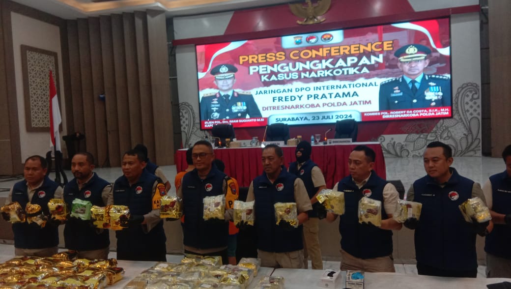Menggelar Press Release di Mapolda Jatim dihadiri, Kapolda Jatim Irjen Pol. Drs. Imam Sugianto, M.Si, didampingi Ditresnarkoba Polda Jatim Kombes Pol. Robert Da costa, S.I.K., MH., Kabidhumas Polda Jatim Kombes Pol. Dirmanto beserta jajarannya.