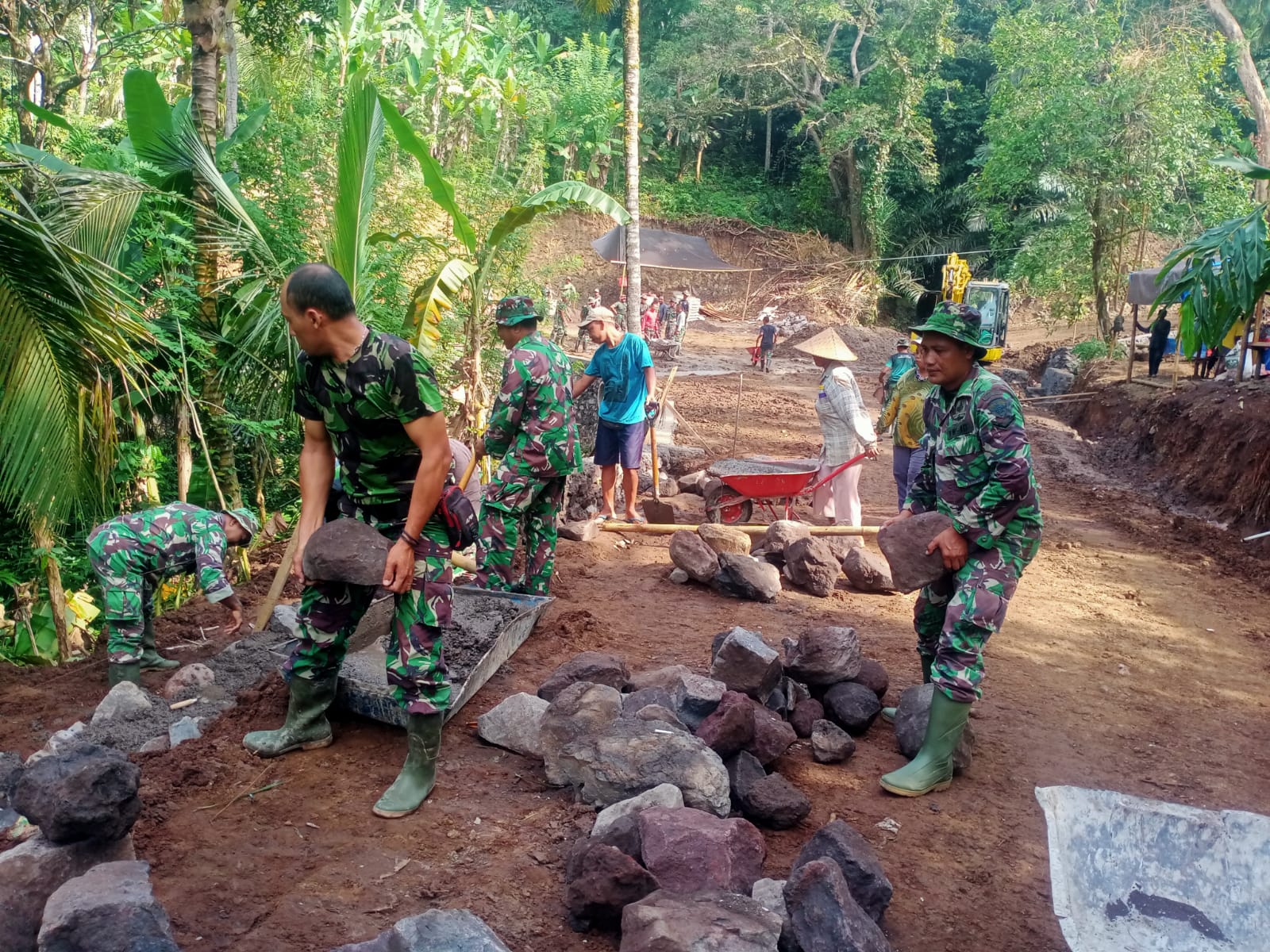 “Ayo kejar saya pak, tambah lagi kecepatannya” tutur salah satu prajurit yang tampak dengan semangat mengangkat batu di pundaknya. Suasana akrab dan kompak terlihat jelas, hal inilah yang menjadikan hubungan diantara masyarakat dan TNI senantiasa harmonis. Masyarakat merupakan penyemangat tersendiri bagi para TNI dalam turut membantu dan mendukung terlaksananya kegiatan TMMD ke-119, meski dihadapkan dengan cuaca yang sering hujan dan medan yang cukup ekstrim.